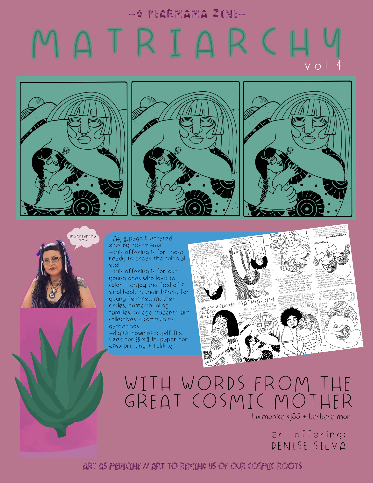 Each page of this zine shares a truth from the ancient heartspace, created with love as we reimagine indigenous futures + collective liberation. Volume 4 is about principles of matriarchal systems thru words from The Great Cosmic Mother, Rediscovering the Religion of the Earth by Monica Sjöö + Barbara Mor.